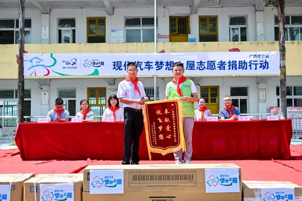 在捐贈儀式上賓陽縣中華鎮(zhèn)育才村委學(xué)校校長代表全校師生對現(xiàn)代汽車集團及南寧通源在本次活動中做出的貢獻表示了感謝,并贈與南寧通源“奉獻愛心放飛夢想”的感謝錦旗。